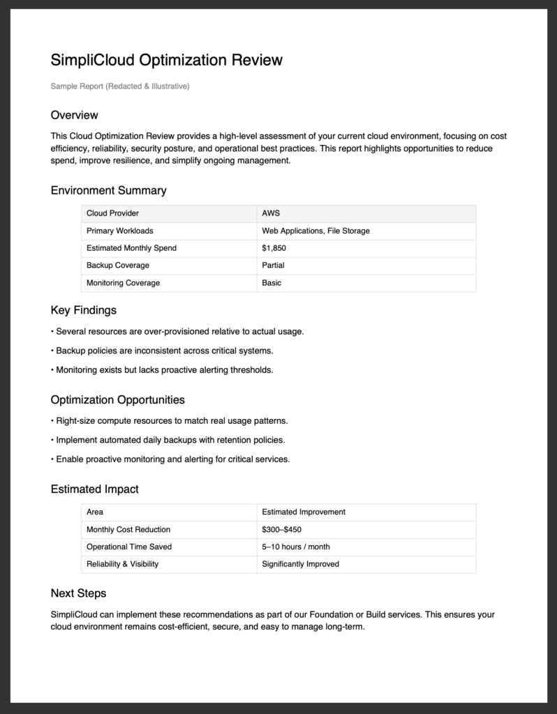 An example of the insights and recommendations delivered after a cloud optimization review.